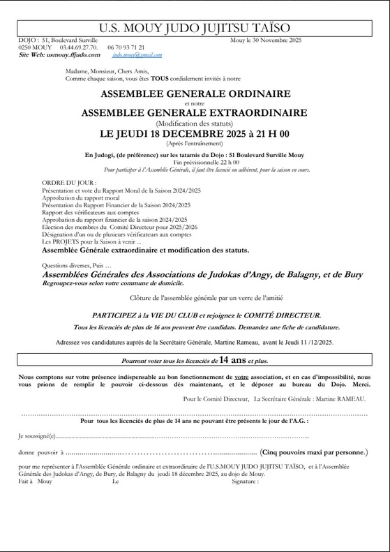 Invitation à Assemblée Générale en date du Jeudi 18 Décembre 2025 à 21h00